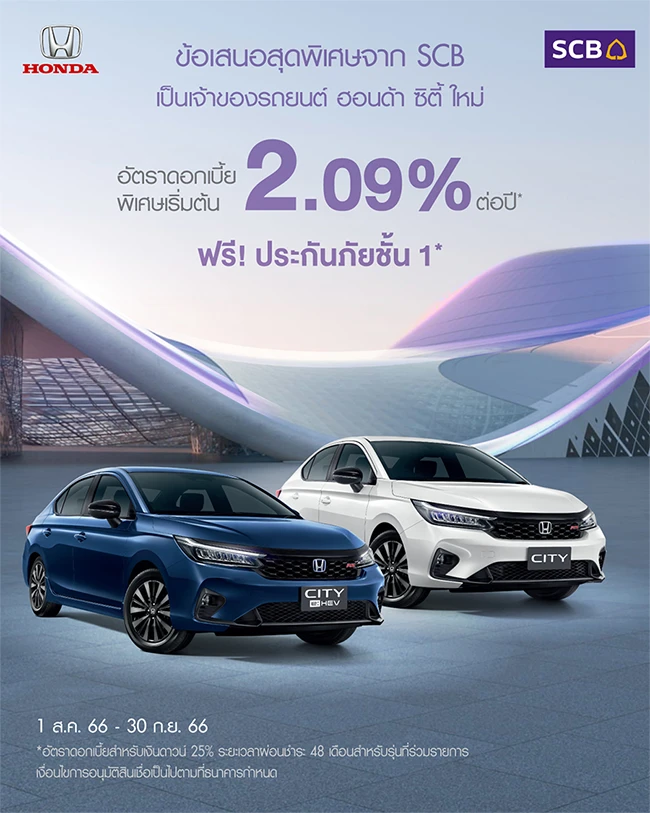 สิทธิพิเศษนี้สำหรับลูกค้าที่ซื้อรถยนต์ฮอนด้า รุ่นซิตี้ ใหม่ และ ซิตี้ อี:เอชอีวี ใหม่ ที่โชว์รูมฮอนด้าทั่วประเทศ และแจ้งความประสงค์ขอสินเชื่อเช่าซื้อรถยนต์ใหม่กับธนาคารไทยพาณิชย์ ที่สมัครขอสินเชื่อรถยนต์ใหม่ ระหว่างวันที่ 1 สิงหาคม 2566 - 30 กันยายน 2566 ได้รับการอนุมัติ รวมถึงออกรถและทำสัญญาเช่าซื้อภายในวันที่ 30 กันยายน 2566