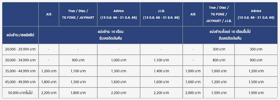 - เมื่อมียอดผ่อนชำระสินค้า iPhone ทุกรุ่น 10 เดือนขึ้นไป ราคาตั้งแต่ 20,000 บาทขึ้นไป/เซลล์สลิป