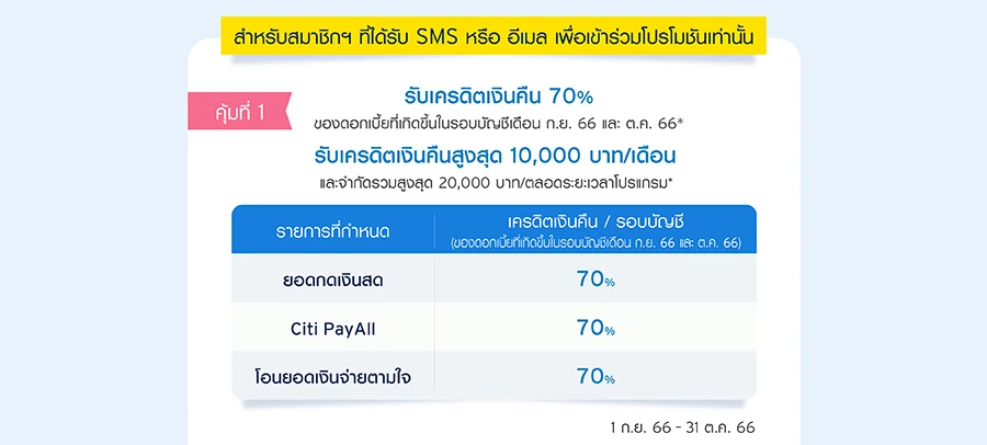 - ยอดใช้จ่ายในรายการส่งเสริมการขายนี้ จะนับเฉพาะยอดการทำรายการกดเงินสด / Citi PayAll / โอนยอดเงินจ่ายตามใจ ภายในรอบบัญชีเดือน ก.ย. 66 และ ต.ค. 66 เท่านั้น
