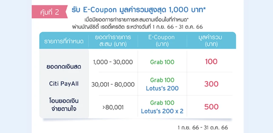 - รับ Grab E-Coupon มูลค่า 100 บาท และ Lotus’s E-Coupon 200 บาท เมื่อมียอดการทำรายการสะสมจากรายการ กดเงินสด / Citi PayAll / โอนยอดเงินจ่ายตามใจ ตั้งแต่ 30,001 - 80,000 บาท