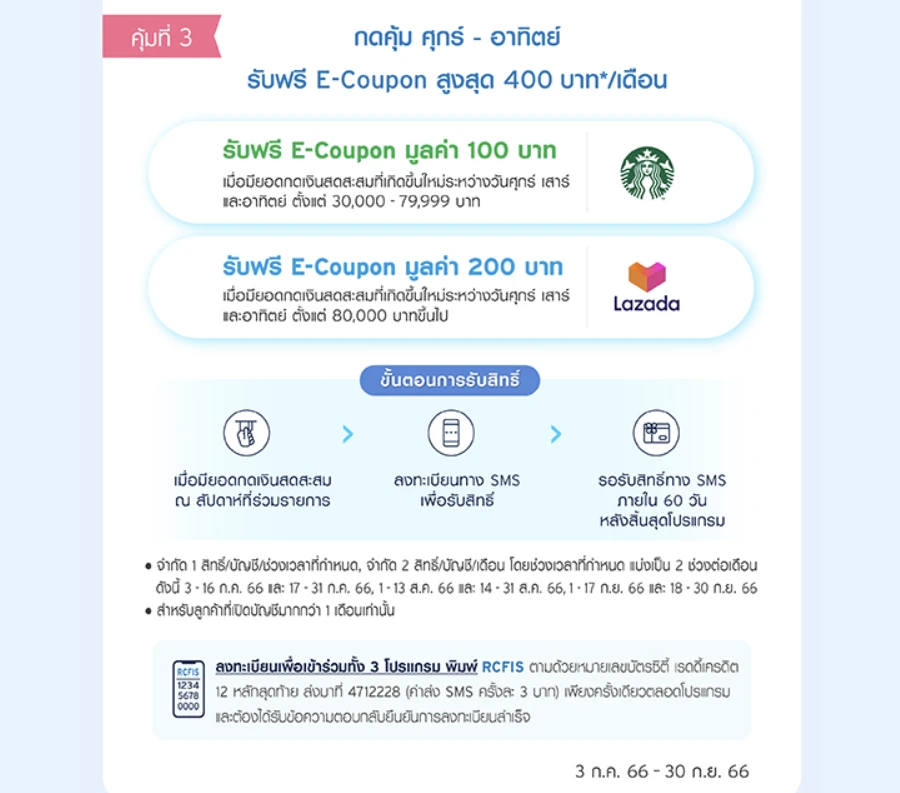 - จำกัดการรับ E-Coupon จำกัด 1 สิทธิ์/ผู้ถือบัตรฯ /ช่วงเวลาที่กำหนด, สูงสุด 2 สิทธิ์/สมาชิกฯ/เดือน และจำกัดการรับ E-Coupon รวมสูงสุด 6 สิทธิ์/สมาชิกฯ/ตลอดโปรแกรม