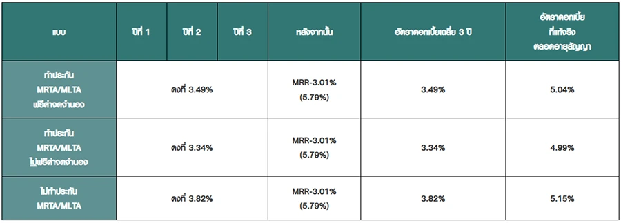 - อัตราดอกเบี้ยทางเลือกแบบทำประกัน MRTA/MLTA ลูกค้าต้องสมัครทำประกัน MRTA/MLTA ผ่านธนาคาร ตามเงื่อนไขที่ธนาคารกำหนด คือ ทุนประกัน 100% ของวงเงินสินเชื่อ ระยะความคุ้มครองขั้นต่ำ 10 ปี