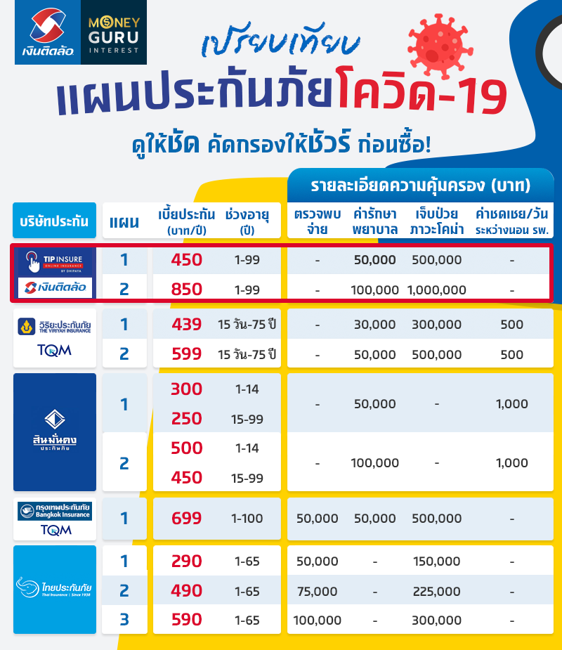 - ผลประโยชน์และความคุ้มครองเป็นไปตามข้อกำหนดและเงื่อนไขกรมธรรม์ประกันภัยคุ้มครองการติดเชื้อไวรัสโคโรนา (โควิด-19)