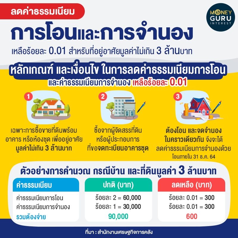 มาตรการลดค่าธรรมเนียมจดทะเบียนสิทธิ และนิติกรรมสำหรับที่อยู่อาศัย มาตรการลดค่าธรรมเนียมฯ มีวัตถุประสงค์เพื่อสนับสนุน และบรรเทาภาระให้แก่ประชาชนที่ต้องการซื้อที่อยู่อาศัยใหม่เป็นของตนเอง รวมถึงช่วยรักษาระดับกิจกรรมทางเศรษฐกิจในภาคอสังหาริมทรัพย์ซึ่งเชื่อมโยงกับการจ้างงาน และธุรกิจที่เกี่ยวเนื่องกับภาคอสังหาริมทรัพย์ในสถานการณ์การแพร่ระบาดของ COVID-19 โดยลดค่าธรรมเนียมการโอนจากร้อยละ 2 ลงเหลือร้อยละ 0.01 และลดค่าธรรมเนียมการจำนองจากร้อยละ 1 ลงเหลือร้อยละ 0.01 (เฉพาะการโอนและจดจำนองในคราวเดียวกัน) สำหรับที่อยู่อาศัยใหม่ ราคาไม่เกิน 3 ล้านบาทต่อหน่วย ซึ่งครอบคลุมบ้านเดี่ยว บ้านแฝด บ้านแถว อาคารพาณิชย์ และห้องชุด ที่ซื้อจากผู้ประกอบการ ตั้งแต่วันถัดจากวันที่ลงประกาศกระทรวงมหาดไทยในราชกิจจานุเบกษาถึงวันที่ 31 ธันวาคม 2564