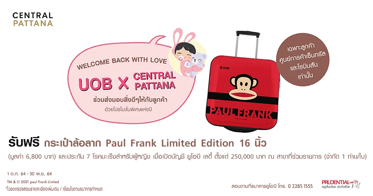 โปรแรงระดับตำนาน! เปิดบัญชีออมทรัพย์ ยูโอบี เลดี้ รับกระเป๋าล้อลาก Paul Frank Limited Edition ณ สาขาธนาคารยูโอบี ที่ร่วมรายการ