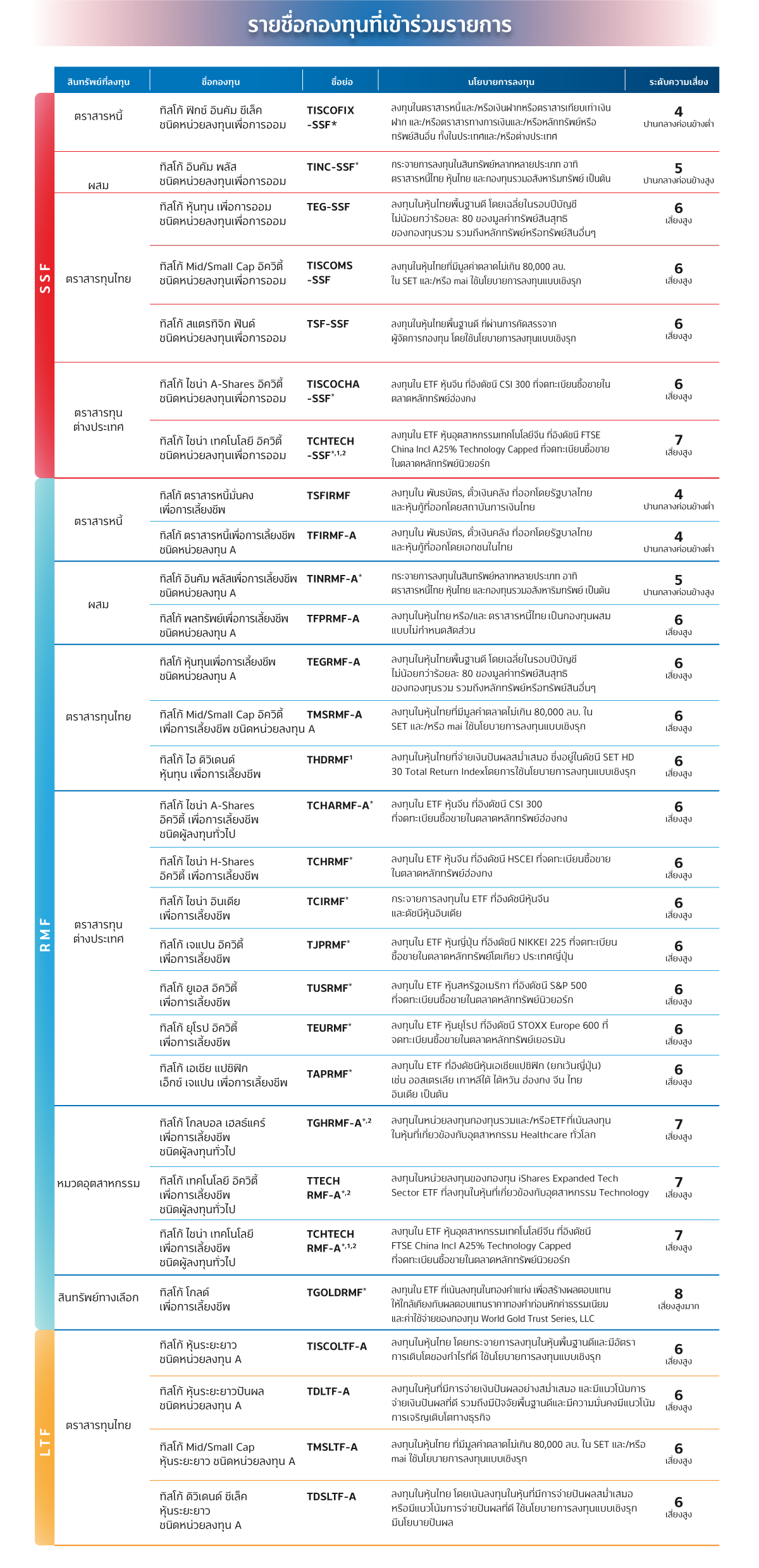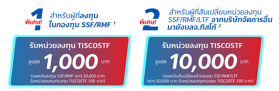 - (1) สงวนสิทธิ์สำหรับลุกค้าบุคคลธรรมดาที่มียอดเงินลงทุนกองทุน SSF/RMF ที่ร่วมรายการ ระหว่างวันที่ 1 ต.ค. 64 - 31 ม.ค. 65 โดยยอดเงินลงทุนทุกๆ 50,000 บาท จะได้รับหน่วยลงทุนกองทุนเปิด ทิสโก้ พันธบัตรระยะสั้น ("TISCOSTF") มูลค่า 100 บาทสูงสุด 1,000 บาท