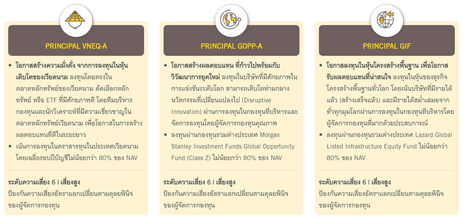 - PRINCIPAL VNEQ-A, PRINCIPAL GOPP-A และ PRINCIPAL GIF เป็นกองทุนรวมตราสารทุนต่างประเทศ โดยกองทุน อาจทำสัญญาป้องกันความเสี่ยงจากอัตราแลกเปลี่ยนเงินในหลักทรัพย์สกุลเงินตราต่างประเทศ ที่กองทุนถืออยู่ โดยขึ้นอยู่กับดุลยพินิจของบริษัทจัดการผู้ลงทุนอาจขาดทุนหรือได้รับผลกำไรจากอัตราแลกเปลี่ยนเงิน หรือได้รับเงินคืนต่ำกว่าเงินลงทุนเริ่มแรกได้