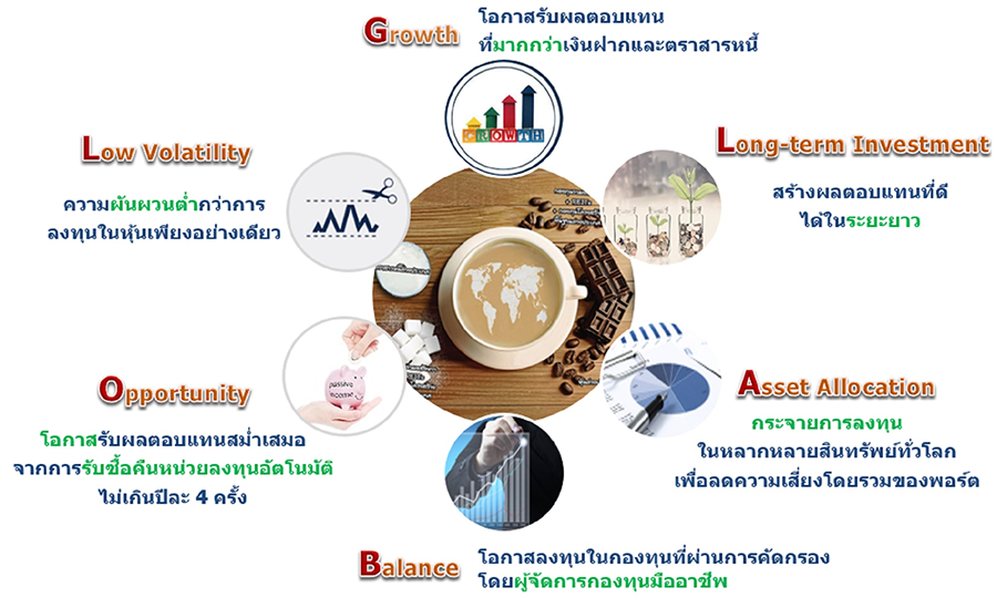 - กระจายการลงทุนในหลากหลายสินทรัพย์ด้วยสัดส่วนที่ช่วยสร้างผลตอบแทนที่ดีในระยะยาว