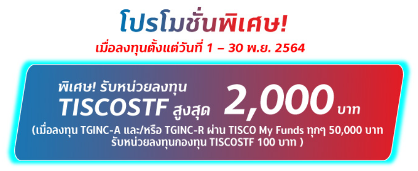โปรโมชั่นพิเศษ! รับหน่วยลงทุน TISCOSTF สูงสุด 2,000 บาท เมื่อลงทุน TGINC-A และ/หรือ TGINC-R ผ่าน TISCO My Funds เท่านั้น