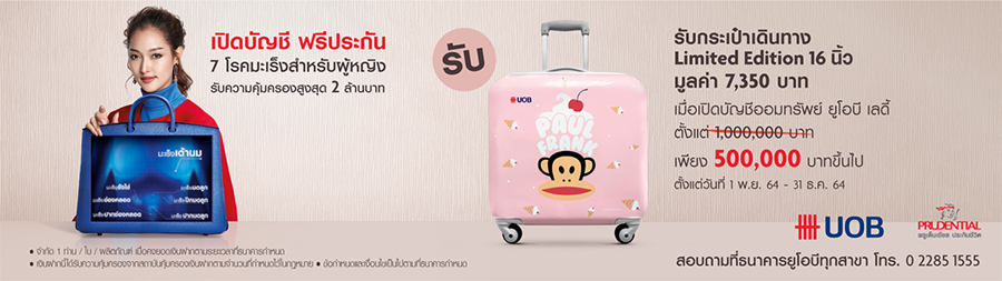 เปิดบัญชี UOB Lady’s savings ตั้งแต่ 500,000 บาท พร้อมคงเงินตามเงื่อนไข ณ สาขาธนาคารยูโอบี สำหรับลูกค้าใหม่ที่เปิดบัญชีออมทรัพย์ ยูโอบี เลดี้ ตั้งแต่ 1 พ.ย. 64 – 31 ธ.ค. 64 และมียอดเงินฝาก 500,000 บาทเป็นต้นไป ณ วันเปิดบัญชี ติดต่อกันตามระยะเวลาที่กำหนด จะได้รับ Paul Frank Trolley Bag 16 นิ้ว จำนวน 1 ชิ้น มูลค่า 7,350 บาท ซึ่งมูลค่าของกำนัลเทียบเท่าดอกเบี้ยเงินฝากที่เพิ่มขึ้นร้อยละ 1.47 ต่อปี คำนวณจากมูลค่าของกำนัล 7,350 บาท สำหรับยอดเงินฝาก 500,000 บาทตลอดระยะเวลา 1 ปี