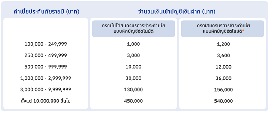 - ผู้เอาประกันภัยจะได้รับเงินคืนเข้าบัญชีเงินฝากเฉพาะการชำระค่าเบี้ยประกันภัยปีแรก โดยคำนวณจากเบี้ยประกันภัยมาตรฐานปีแรกเท่านั้น ทั้งนี้ ผู้เอาประกันภัยมีสิทธิได้รับเงินคืนจากกรมธรรม์ทุกฉบับที่เป็นไปตามเงื่อนไข ในกรณีที่ ผู้เอาประกันภัยมีกรมธรรม์หลายฉบับ สามารถนำค่าเบี้ยประกันภัยมารวมกันได้ เฉพาะกรมธรรม์ที่ซื้อภายในเดือนเดียวกันเท่านั้น