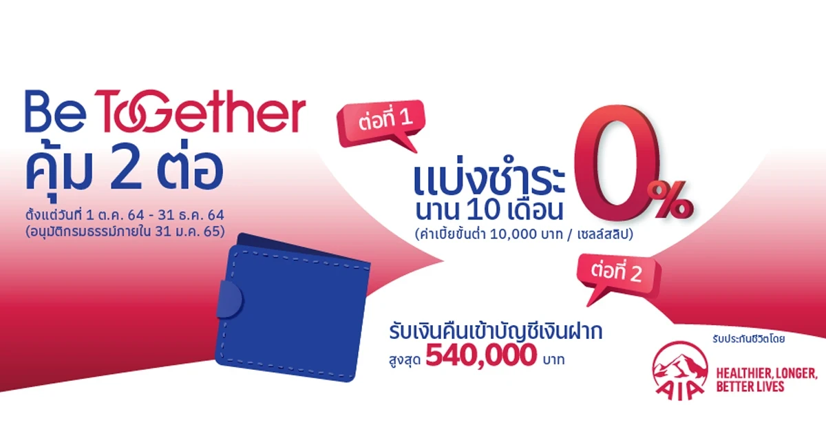 โปรโมชั่นพิเศษ สำหรับลูกค้าประกันชีวิต Be Together คุ้ม 2 ต่อ เมื่อสมัครประกันชีวิต บี ทูเกตเทอร์ ตั้งแต่ 1 ต.ค. 64 - 31 ธ.ค. 64 (อนุมัติกรมธรรม์ภายใน 31 ม.ค. 65)