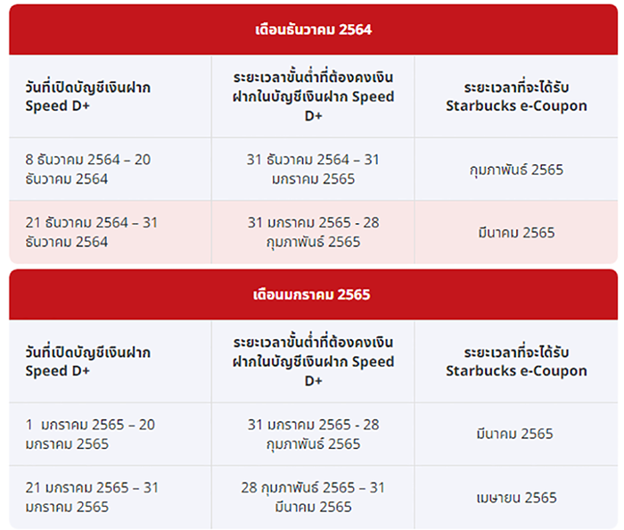 ต่อที่ 1 รับ Starbucks e-Coupon มูลค่า 1,000 บาท สำหรับลูกค้าที่มียอดเงินฝากตั้งแต่ 2,000,000 บาท (สองล้านบาท) ขึ้นไป และต้องคงยอดเงินฝากต่อเนื่องกันอย่างน้อย 2 เดือน ในบัญชีเงินฝาก Speed D+ นับตั้งแต่วันที่เปิดบัญชีฯ ซึ่งการคำนวณยอดเงินฝากจะนับรวมตั้งแต่วันที่เปิดบัญชีฯ และวันที่มีเงินฝากในบัญชีฯ จนถึง ณ วันสุดท้ายของแต่ละเดือน