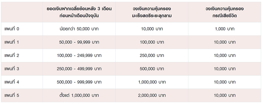 ข้อกำหนด และเงื่อนไขความคุ้มครอง : รับความคุ้มครองมะเร็งระยะลุกลามในสตรี สูงสุด 2 ล้านบาท และความคุ้มครองชีวิตสูงสุด 10,000 บาท ต่อคน โดยคำนวณจากยอดเงินฝากเฉลี่ยย้อนหลัง 3 เดือนก่อนหน้าเดือนปัจจุบัน ตามรายละเอียดดังนี้