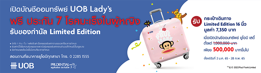 เปิดบัญชี UOB Lady’s savings ตั้งแต่ 500,000 บาท พร้อมคงเงินตามเงื่อนไข ณ สาขาธนาคารยูโอบี สำหรับลูกค้าใหม่ที่เปิดบัญชีออมทรัพย์ ยูโอบี เลดี้ ตั้งแต่ 2 ม.ค. 65 – 28 ก.พ. 65 และมียอดเงินฝาก 500,000 บาทขึ้นไป ณ วันเปิดบัญชี ติดต่อกันตามระยะเวลาที่กำหนด จะได้รับ Paul Frank Trolley Bag 16 นิ้ว จำนวน 1 ชิ้น มูลค่า 7,350 บาท ซึ่งมูลค่าของกำนัลเทียบเท่าดอกเบี้ยเงินฝากที่เพิ่มขึ้นร้อยละ 1.47 ต่อปี คำนวณจากมูลค่าของกำนัล 7,350 บาท สำหรับยอดเงินฝาก 500,000 บาทตลอดระยะเวลา 1 ปี