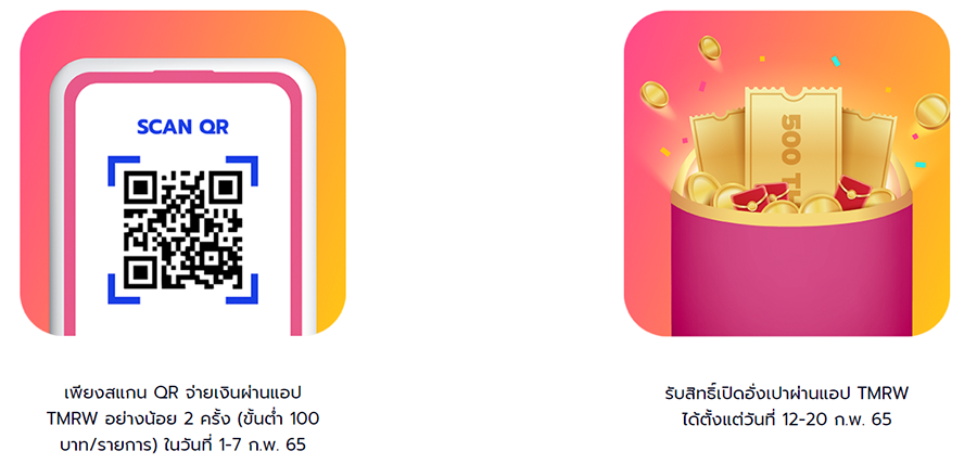 - ทำรายการสแกน QR จ่ายเงินผ่านแอป TMRW อย่างน้อย 2 ครั้ง (ขั้นต่ำ 100 บาท/รายการ) จากบัญชี TMRW Everyday ในช่วงระยะเวลาส่งเสริมการขาย ตั้งแต่วันที่ 1 – 7 กุมภาพันธ์ 2565