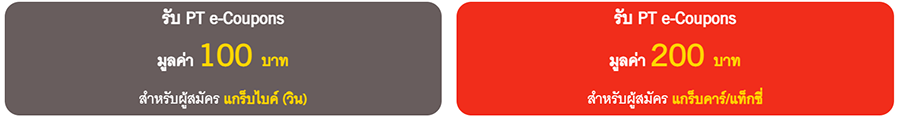 - ผู้สมัครที่ลงทะเบียนเป็นพาร์ทเนอร์แกร็บไบค์ (วิน) จะได้รับ PT e-Coupons มูลค่า 100 บาท ส่วนผู้สมัครที่ลงทะเบียนเป็นพาร์ทเนอร์แกร็บคาร์/แท็กซี่ จะได้รับ