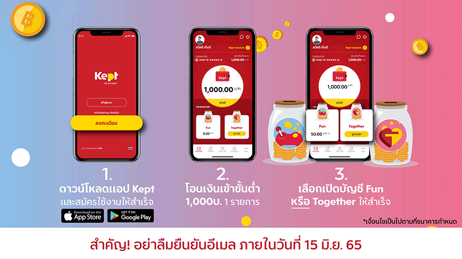 - ลูกค้าจะต้องดาวน์โหลดแอป Kept และสมัครสำเร็จ ระหว่างวันที่ 1 กุมภาพันธ์ - 31 พฤษภาคม 2565 พร้อมโอนเงินเข้าบัญชี Kept ขั้นต่ำ 1,000 บาท 1 รายการ และเลือกเปิดบัญชี Fun หรือ Together บัญชีใดบัญชีหนึ่งให้สำเร็จภายใน 7 วัน นับจากวันที่สมัครสำเร็จ ทั้งนี้ ลูกค้าจะต้องทำการลงทะเบียนยืนยันอีเมล (Verified e-mail) ภายในวันที่ 15 มิถุนายน 2565 เพื่อให้ธนาคารสามารถจัดส่งโค้ดส่วนลดผ่านทางอีเมลของลูกค้าตามที่ได้ลงทะเบียนไว้ ในกรณีที่ลูกค้าไม่ทำการลงทะเบียนยืนยันอีเมลภายในระยะเวลาที่กำหนดดังกล่าวจะถือว่าสละสิทธิ์