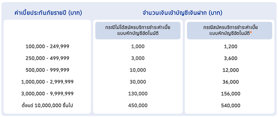 - ผู้เอาประกันภัยจะได้รับเงินคืนเข้าบัญชีเงินฝากเฉพาะการชำระค่าเบี้ยประกันภัยปีแรก โดยคำนวณจากเบี้ยประกันภัยมาตรฐานปีแรกเท่านั้น ทั้งนี้ ผู้เอาประกันภัยมีสิทธิได้รับเงินคืนจากกรมธรรม์ทุกฉบับที่เป็นไปตามเงื่อนไขในกรณีที่ผู้เอาประกันภัยมีกรมธรรม์หลายฉบับ สามารถนำค่าเบี้ยประกันภัยมารวมกันได้ เฉพาะกรมธรรม์ที่ซื้อภายในเดือนเดียวกันเท่านั้น