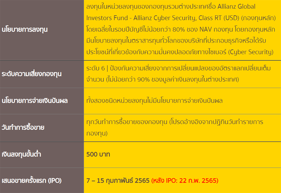 - กองทุนเปิดกรุงศรีไซเบอร์ซีเคียวริตี้-สะสมมูลค่า (KFCYBER-A)