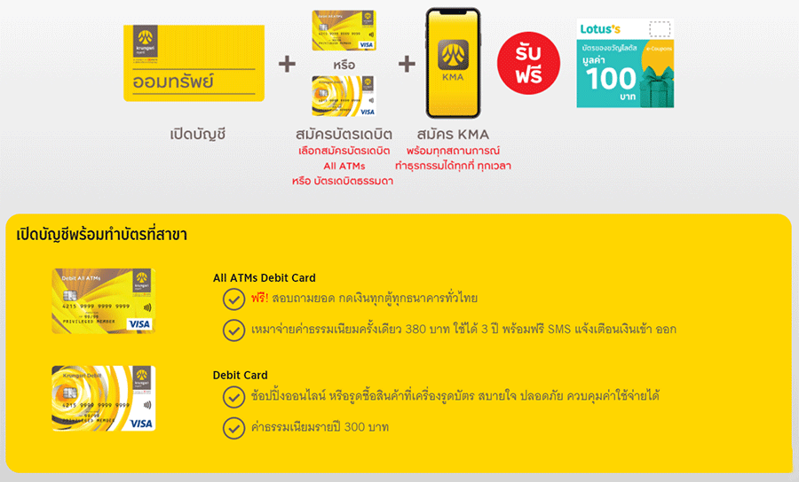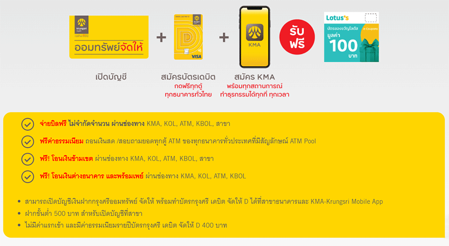 - สิทธิพิเศษสำหรับลูกค้าบุคคลธรรมดา ที่เลือกสมัครโซลูชั่นบัญชีชุดสะดวกคล่องตัวเพื่อทำธุรกรรม จะต้องทำการเปิดบัญชีเงินฝากออมทรัพย์ใหม่ หรือบัญชีเงินฝากออมทรัพย์จัดให้ใหม่ ควบคู่กับสมัครและชำระค่าธรรมเนียมบัตรกรุงศรี เดบิต ทุกประเภท ใหม่ (ที่ได้ชำระค่าธรรมเนียมเต็มจำนวน) พร้อมทั้งดาวน์โหลด KMA-Krungsri Mobile App ในช่วงระหว่างวันที่ 16 กุมภาพันธ์ 2565 - 30 มิถุนายน 2565 ทั้งนี้ สำหรับลูกค้าที่ใช้ KMA-Krungsri Mobile App อยู่แล้วในปัจจุบันสามารถเข้าร่วมรายการได้ (ยกเว้นบัญชีเงินฝากประเภทร่วม, เพื่อ, โดย และบัตร Krungsri Boarding Card ไม่สามารถเข้าร่วมรายการส่งเสริมการขายนี้ได้)