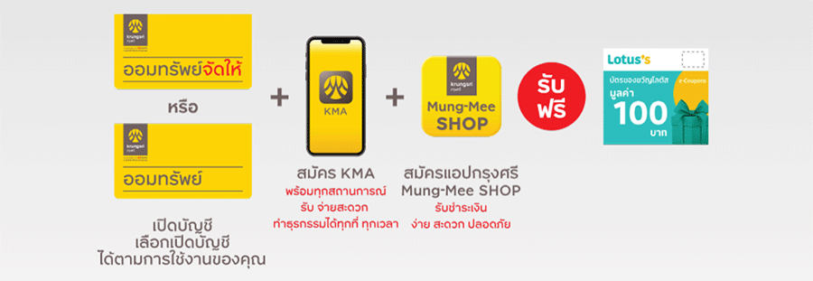 มีบัญชีเงินฝากกรุงศรีออมทรัพย์ จัดให้ หรือบัญชีเงินฝากออมทรัพย์ธนาคารกรุงศรี และใช้บริการ KMA สามารถทำการสมัครได้ด้วยตนเอง ผ่านการดาวน์โหลด Mung-Mee shop app