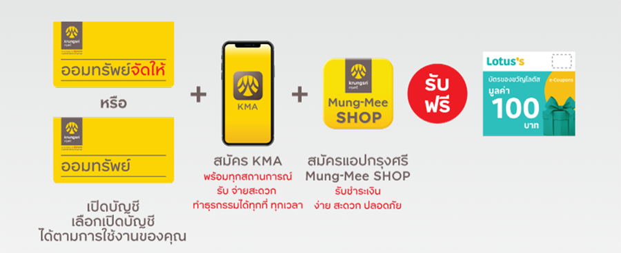 - สิทธิพิเศษสำหรับลูกค้าบุคคลธรรมดาที่เป็นเจ้าของธุรกิจ ที่สมัครโซลูชั่นชุดมั่งมีเพื่อธุรกิจ จะต้องทำการเปิดบัญชีเงินฝากออมทรัพย์ใหม่ หรือ บัญชีเงินฝากออมทรัพย์จัดให้ใหม่ พร้อมทั้งดาวน์โหลด KMA - Krungsri Mobile App และสมัคร กรุงศรี มั่งมี ช้อป แอปพลิเคชันใหม่ และเลือกบัญชีดังกล่าวเป็นบัญชีรับเงินใน กรุงศรี มั่งมี ช้อป แอปพลิเคชัน ในช่วงระหว่างวันที่ 16 กุมภาพันธ์ 2565 - 30 มิถุนายน 2565 ทั้งนี้ สำหรับลูกค้าที่มีบัญชีออมทรัพย์ หรือบัญชีออมทรัพย์จัดให้ และใช้ KMA - Krungsri Mobile App อยู่แล้วในปัจจุบัน สามารถเข้าร่วมรายการส่งเสริมการขายนี้ได้ (ยกเว้นบัญชีเงินฝากประเภทร่วม, เพื่อ, โดย ไม่สามารถเข้าร่วมรายการส่งเสริมการขายนี้ได้)