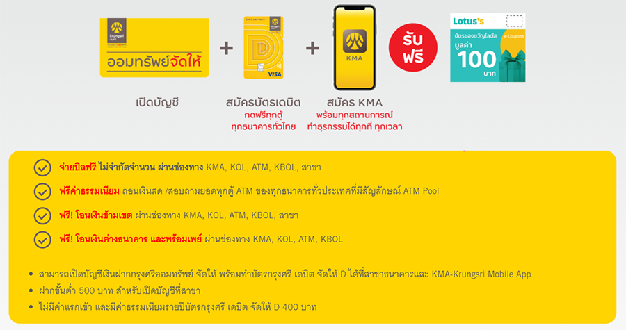 - สิทธิพิเศษสำหรับลูกค้าบุคคลธรรมดา ที่สมัครโซลูชั่นชุดสะดวกคล่องตัวเพื่อทำธุรกรรม จะต้องทำการเปิดบัญชีเงินฝากออมทรัพย์ใหม่ หรือบัญชีเงินฝากออมทรัพย์จัดให้ใหม่ ควบคู่กับสมัครและชำระค่าธรรมเนียมบัตรกรุงศรี เดบิต ทุกประเภท ใหม่ (ที่ได้ชำระค่าธรรมเนียมเต็มจำนวน) พร้อมทั้งดาวน์โหลด KMA - Krungsri Mobile App ในช่วงระหว่างวันที่ 16 กุมภาพันธ์ 2565 - 30 มิถุนายน 2565 ทั้งนี้ สำหรับลูกค้าที่ใช้ KMA - Krungsri Mobile App อยู่แล้วในปัจจุบันสามารถเข้าร่วมรายการได้ (ยกเว้นบัญชีเงินฝากประเภทร่วม, เพื่อ, โดย และบัตร Krungsri Boarding Card ไม่สามารถเข้าร่วมรายการส่งเสริมการขายนี้ได้)