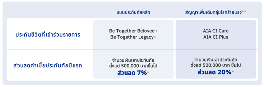 - สัญญาเพิ่มเติมกลุ่มโรคร้ายแรง ได้แก่ AIA CI Care, AIA CI Plus - รายการส่งเสริมการขายนี้สำหรับกรมธรรม์ใหม่ที่ชำระเบี้ยประกันภัยแบบรายปี รวมถึงค่าเบี้ยประกันภัยสัญญาเพิ่มเติมที่ชำระเป็นรายปี ทั้งนี้ สำหรับประกันชีวิตของ บริษัท เอไอเอ จำกัด (บริษัทฯ) ที่ให้บริการผ่านธนาคารกรุงเทพ โดยนำส่งระหว่างวันที่ 1 มี.ค. 65 - 31 มี.ค. 65 และได้รับการอนุมัติกรมธรรม์ภายในวันที่ 31 มี.ค. 65 เท่านั้น