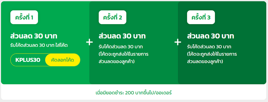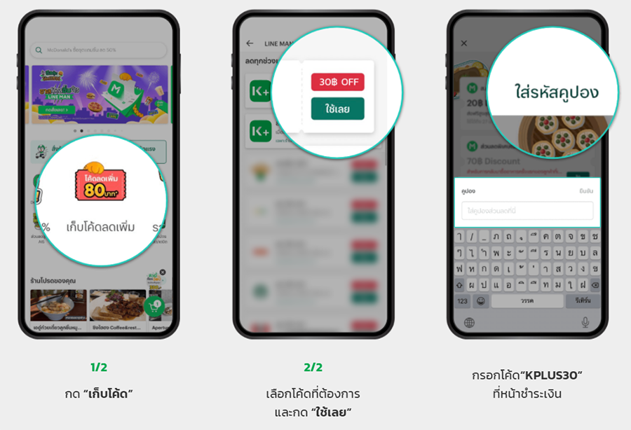 - บมจ.ธนาคารกสิกรไทย ("ธนาคาร") ขอสงวนสิทธิ์รายการส่งเสริมการขายนี้สำหรับลูกค้าที่เป็นผู้ใช้บริการ K PLUS ของธนาคาร และชำระค่าอาหารด้วย K PLUS เป็นครั้งแรกในแอปพลิเคชัน LINE MAN เท่านั้น โดยลูกค้าต้องมียอดชำระค่าอาหาร ตั้งแต่ 200 บาทขึ้นไป/ออเดอร์ และกรอกโค้ด KPLUS30 เพื่อรับส่วนลด 30 บาท และเมื่อทำรายการสำเร็จ ลูกค้าจะได้รับโค้ดส่วนลดเพิ่มเติมอีก 2 โค้ด มูลค่า 30 บาท/โค้ด ในรายการ "คูปองส่วนลด" ทันที โดยโค้ดส่วนลดดังกล่าวจะใช้ได้ต่อเมื่อมียอดชำระค่าอาหารตั้งแต่ 200 บาทขึ้นไป/ออเดอร์ เท่านั้น