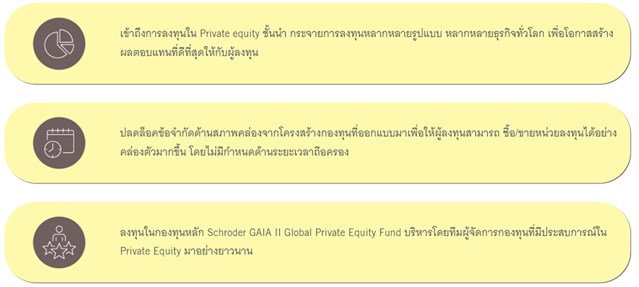 - ลงทุนในความมีส่วนได้เสียจากความเป็นเจ้าของ (Equity Interests) ของบริษัทที่ไม่ได้จดทะเบียนซื้อขายในตลาดหลักทรัพย์ (Private Equity) ทั่วโลก ผ่านกองทุนรวมต่างประเทศ Schroder GAIA II Global Private Equity Fund โดยเฉลี่ยไม่น้อยกว่า 80% ของ NAV