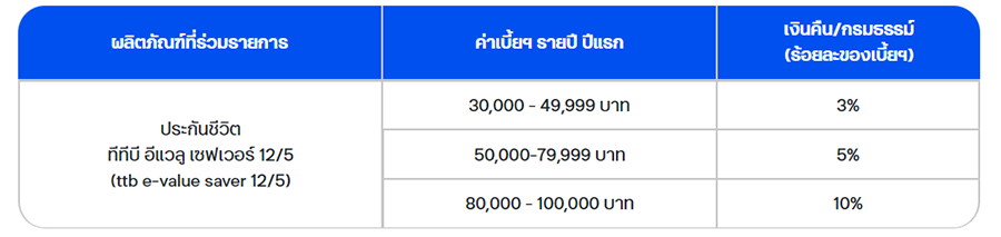 สิทธิพิเศษสำหรับลูกค้าทีทีบีที่ซื้อประกันชีวิต ทีทีบี อีแวลู เซฟเวอร์ 12/5 (ttb e-value saver 12/5) ผ่านแอป ทีทีบี ทัช จะได้รับเงินคืนเข้าบัญชีเงินฝากสูงสุด 10,000 บาท ต่อกรมธรรม์ เมื่อชำระค่าเบี้ยประกันชีวิตปีแรกตั้งแต่ 30,000 บาท ขึ้นไป และกรมธรรม์ต้องได้รับการอนุมัติโดยมีผลบังคับจนถึงวันที่คืนเงินเข้าบัญชี