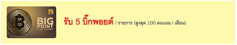 - สมาชิกบิ๊กพอยต์ฝากเงินสดเข้าบัญชีธนาคารกรุงศรี รับ 5 บิ๊กพอยต์/รายการ (สูงสุด 100 คะแนน/เดือน/หมายเลขบิ๊กพอยต์)