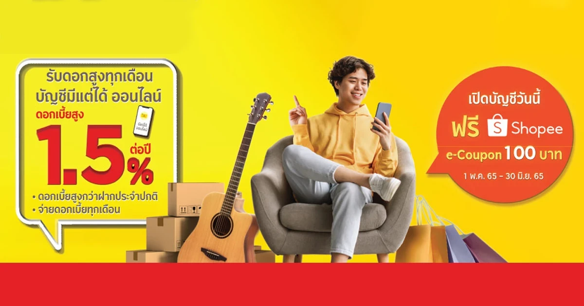- ลูกค้าต้องคงสถานะการใช้บัญชีออมทรัพย์ มีแต่ได้ ออนไลน์ จนถึงวันที่ได้รับ Shopee e-Coupon เท่านั้น หากไม่คงสถานะภายในช่วงระยะเวลาดังกล่าว ขอสงวนสิทธิ์งดให้ของกำนัลในทุกกรณี
