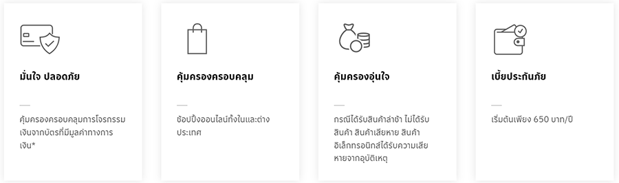 | 4. ความสูญเสียหรือความเสียหายทางกายภาพโดยสิ้นเชิงของสินค้าอิเล็กทรอนิกส์ อันเนื่องมาจากอุบัติเหตุภายในระยะเวลา 7 วัน นับจากวันที่ผู้เอาประกันภัยได้รับสินค้าอิเล็กทรอนิกส์ โดยจะชดเชย 20% ของราคาสินค้าจริง และมียอดการสั่งซื้อแต่ละครั้ง เป็นจำนวนเงินตั้งแต่ 500 บาทขึ้นไปต่อครั้งไม่เกิน (สูงสุดไม่เกิน 3 ครั้ง/ปีกรมธรรม์ประกันภัย) | 2,000 | 3,000 | 4,000 |