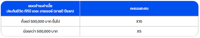 - การคำนวนคะแนนสะสมรวม / 1 บัญชีลูกค้า (คำนวณรวมยอดใช้จ่ายทุกบัตรจากบัตรหลักและบัตรเสริม) / ยอดซื้อประกันชีวิตที่ร่วมรายการใน 1 เดือน จะคำนวณจากยอดซื้อประกันชีวิตแต่ละรอบ ณ วันสิ้นเดือน โดยนับยอดซื้อรวมตั้งแต่วันที่ 1 – วันที่สิ้นเดือนนั้น ๆ