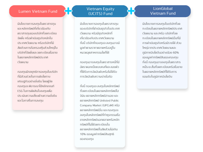นโยบายการลงทุน : กองทุนจะลงทุนในหรือมีไว้ซึ่งหน่วยลงทุนของกองทุนรวมตราสารทุนต่างประเทศ และ/หรือกองทุนรวมอีทีเอฟตราสารทุนต่างประเทศ ที่มีนโยบายการลงทุนในหลักทรัพย์หรือตราสารทุนของบริษัทที่จดทะเบียนจัดตั้งในประเทศเวียดนามหรือจดทะเบียนซื้อขายในตลาดหลักทรัพย์ประเทศเวียดนาม หรือบริษัทที่ดำเนินธุรกิจหลักหรือมีรายได้หลักจากการดำเนินธุรกิจในประเทศเวียดนาม รวมถึงบริษัทอื่นที่มีความเกี่ยวข้องหรือมีความเชื่อมโยงกับประเทศเวียดนาม โดยเฉลี่ยในรอบปีบัญชีไม่น้อยกว่า 80% ของมูลค่าทรัพย์สินสุทธิของกองทุน
