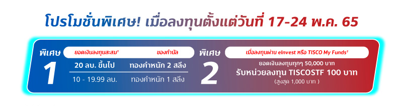 - สงวนสิทธิ์สำหรับลูกค้าบุคคลธรรมดาที่มียอดลงทุนสะสมในกองทุนเปิด ทิสโก้ เวียดนาม อิควิตี้ (TVIETNAM) ตั้งแต่วันที่ 17 - 24 พฤษภาคม 2565 ผ่านช่องทางออนไลน์ของ บลจ.ทิสโก้ ได้แก่ eInvest และ TISCO My Funds เท่านั้น โดยลูกค้าที่มียอดเงินลงทุนทุกๆ 50,000 บาท จะได้รับหน่วยลงทุนกองทุนเปิด ทิสโก้ พันธบัตรระยะสั้น (TISCOSTF) มูลค่า 100 บาท สูงสุด 1,000 บาท (2)