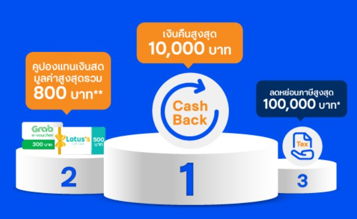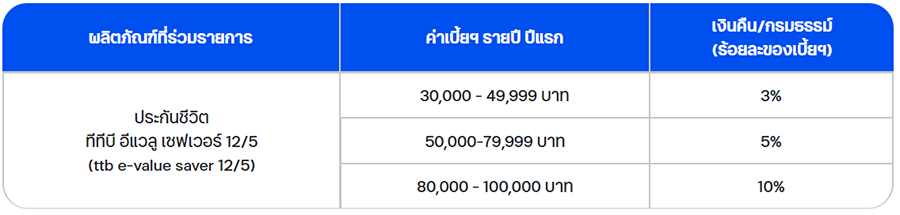 - ต่อที่ 1 จะได้รับเงินคืนเข้าบัญชีเงินฝากสูงสุด 10,000 บาท ต่อกรมธรรม์ เมื่อชำระค่าเบี้ยประกันชีวิตแบบรายปี เฉพาะปีแรกตั้งแต่ 30,000 บาท ขึ้นไป และกรมธรรม์ต้องได้รับการอนุมัติโดยมีผลบังคับจนถึงวันที่คืนเงินเข้าบัญชี