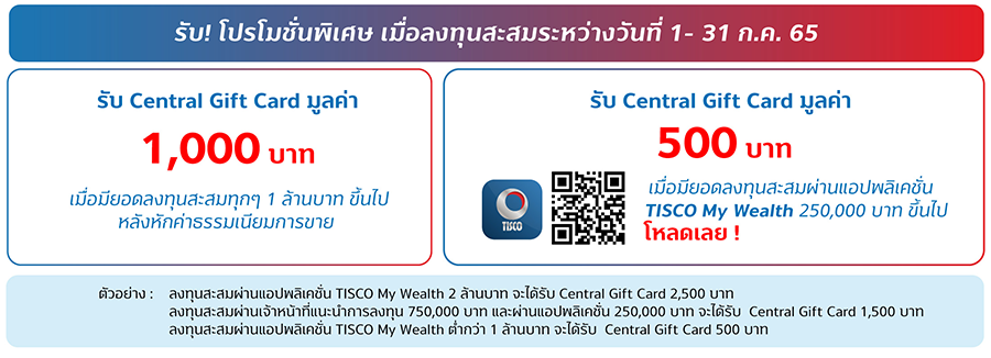 - สำหรับลูกค้าบุคคลธรรมดาที่มียอดสะสมในกองทุน TBIOTECH และ TGHDIGI ผ่านธนาคารทิสโก้ และแอปพลิเคชัน TISCO My Wealth ระหว่างวันที่ 1 - 31 ก.ค. 65
