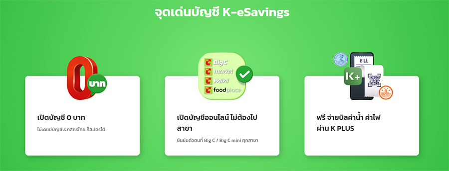 โปรโมชันพิเศษ...ลูกค้าใหม่ K+ เปิดบัญชีเงินฝากออมทรัพย์ K-eSavings พร้อมยืนยันตัวตนที่ KBank Service และฝากเงินเข้าบัญชี ตั้งแต่ 1,000 บาทขึ้นไป (อย่างน้อย 1 รายการ) ผ่านช่องทางใดก็ได้ ภายในเดือนที่เปิดบัญชี รับ e-Voucher Big C 100 บาท*