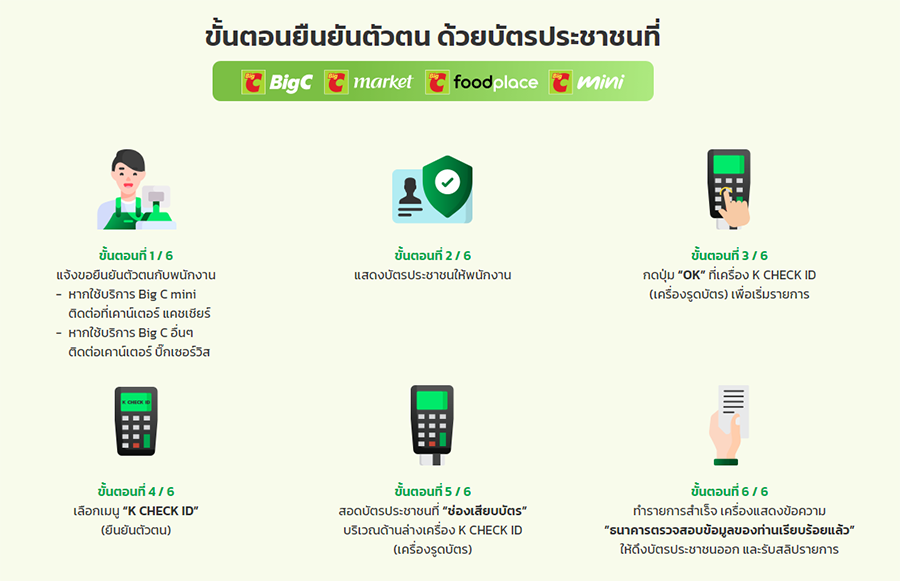 - ("ระยะเวลาโครงการ") และยืนยันตัวตน ณ จุดบริการ KBank Service ที่ บิ๊กซี ซูเปอร์เซ็นเตอร์ หรือบิ๊กซี มินิ หรือบิ๊กซี มาร์เก็ต หรือบิ๊กซี ฟู้ดเพลส เท่านั้น (เฉพาะสาขาที่ให้บริการยืนยันตัวตน)