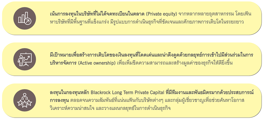 - ลงทุนใน Private Equity และมีกลยุทธ์การลงทุนโดยตรงในหุ้นของบริษัทต่างๆ ที่มีมูลค่าระหว่าง 500 ล้าน ถึง 2,000 ล้านดอลลาร์สหรัฐฯ โดยการเข้าไปมีอำนาจควบคุมหรือร่วมควบคุมในโครงสร้างการถือหุ้นของบริษัทเหล่านี้เป็นหลัก ผ่านกองทุนรวมต่างประเทศ BlackRock Long Term Private Capital, SCSp (โดยเฉลี่ยไม่น้อยกว่า 80% ของ NAV