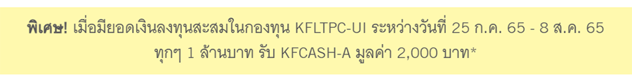 - รายการส่งเสริมการขายนี้ให้เฉพาะยอดเงินลงทุนในกองทุนเปิดกรุงศรีไพรเวทแคปปิตอลระยะยาว-ห้ามขายผู้ลงทุนรายย่อย (KFLTPC-UI) ในช่วงการเสนอขายครั้งแรกเท่านั้น โดยยอดเงินลงทุนสุทธิหมายถึง ยอดซื้อและ/หรือสับเปลี่ยนเข้า หักออกด้วย ยอดขายคืนและ/หรือสับเปลี่ยนออก
