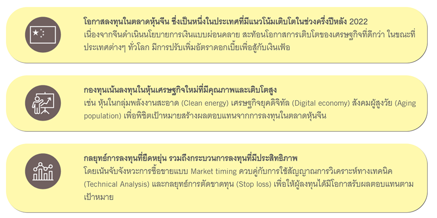 - ลงทุนในตราสารแห่งทุน ตราสารแห่งหนี้ ตราสารกึ่งหนี้กึ่งทุน หน่วย ETF หน่วย CIS หน่วย Property, REITs หน่วย Infra เงินฝาก และ/หรือ ตราสารเทียบเท่าเงินฝาก และ/หรือ หลักทรัพย์หรือทรัพย์สินอื่นๆ ที่จดทะเบียนในตลาดหลักทรัพย์ หรือมีธุรกิจหลักในประเทศจีน และ/หรือ ได้รับผลประโยชน์จากการเติบโตทางเศรษฐกิจของประเทศจีน โดยกองทุนจะพิจารณาปรับสัดส่วนการลงทุนในแต่ละหลักทรัพย์ได้ตั้งแต่ 0-100% ของ NAV