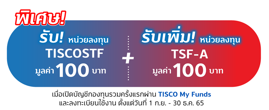 - สงวนสิทธิ์สำหรับลูกค้าบุคคลธรรมดาที่เปิดบัญชีกองทุนรวมกับบลจ.ทิสโก้ครั้งแรกผ่านTISCO My Funds และลงทะเบียนใช้งานตั้งแต่วันที่ 1 ก.ย. – 30 ธ.ค. 65 เท่านั้น จะได้รับของกำนัลเป็นหน่วยลงทุนกองทุนเปิด ทิสโก้ พันธบัตรระยะสั้น (TISCOSTF) มูลค่า 100 บาท และหน่วยลงทุนกองทุนเปิด ทิสโก้ สแตรทิจิก ฟันด์ ชนิดหน่วยลงทุน A (TSF-A) มูลค่า 100 บาท 1 สิทธิ/ลูกค้า 1 ท่าน ทั้งนี้ บริษัทจะจัดสรรหน่วยลงทุน TISCOSTF และ TSF-A ให้แก่ลูกค้าภายใน 90 วัน หลังจากสิ้นสุดโปรโมชั่น