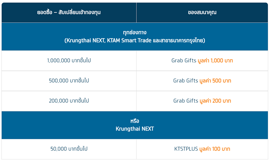 - สำหรับยอดซื้อ –สับเปลี่ยนเข้ากองทุน 200,000 บาทขึ้นไป ธนาคารจะส่ง Grab Gifts หรือ บัตรกำนัลอิเล็กทรอนิกส์ประเภทอื่นที่มีมูลค่าเทียบเท่าให้กับลูกค้า ภายใน 60 วัน นับจากวันสิ้นสุดโครงการ ผ่านทาง Line Krungthai Connext เท่านั้น (ดูรายละเอียดและสมัครบริการ Line Krungthai Connext ได้ที่ https://krungthai.com/th/content/personal/krungthai-connext)