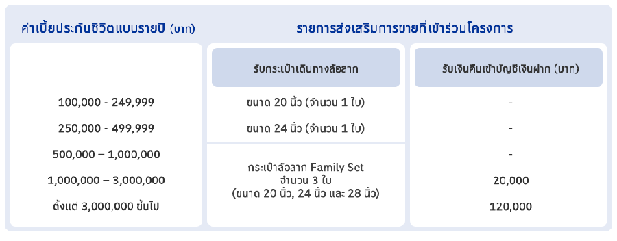 - ผู้เอาประกันภัยจะได้รับกระเป๋าล้อลาก ขนาด 20 นิ้ว, 24 นิ้ว, 28 นิ้ว หรือกระเป๋าเดินทางขนาด 14 นิ้ว ได้ภายใน 90 วันหลังจากวันสุดท้ายของเดือนที่กรมธรรม์ได้รับการอนุมัติ โดยการจัดส่งของสมนาคุณทั้งหมด จะถูกนำส่งให้แก่ผู้เอาประกันภัยตามที่อยู่ที่แจ้งรับกรมธรรม์