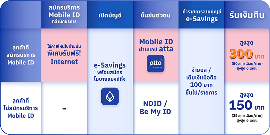 รับเงินคืนสูงสุด 300 บาท สำหรับลูกค้า เอไอเอส, ดีแทค และทรูมูฟเอช ที่ไม่เคยสมัครโมบายแบงก์กิ้ง จากธนาคารกรุงเทพ เพียงเปิดบัญชี e-Savings พร้อมสมัครโมบายแบงก์กิ้ง จากธนาคารกรุงเทพ และยืนยันตัวตนด้วย Mobile ID ผ่านแอป atta พร้อมเติมเงินหรือจ่ายบิลค่าโทรศัพท์มือถือขั้นต่ำ 100 บาท