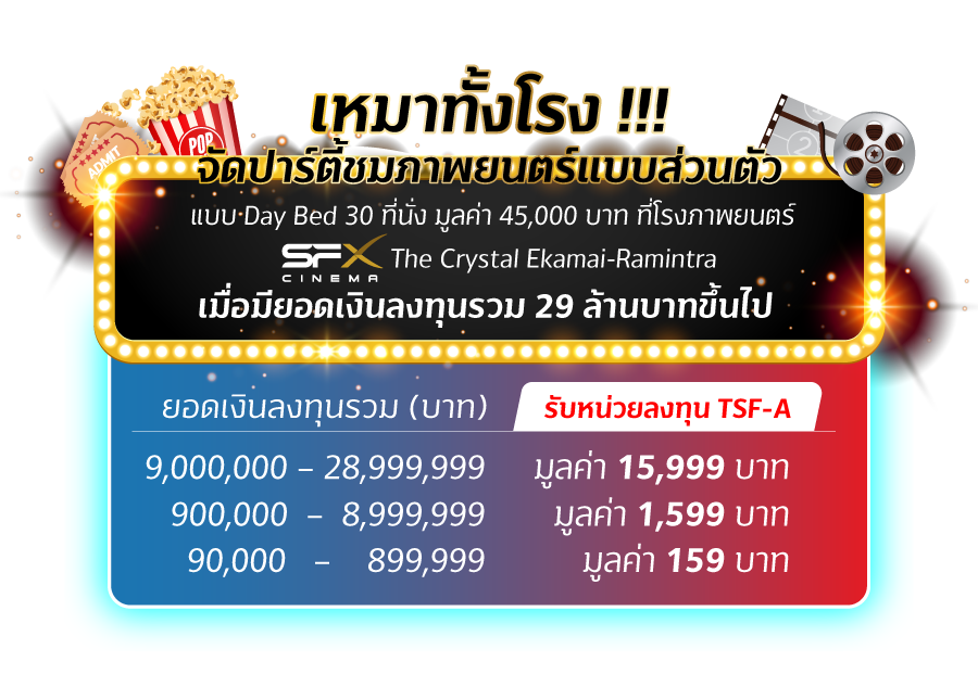 - การรับของกำนัล- บริษัทจะจัดสรรหน่วยลงทุนกองทุนเปิด ทิสโก้ สแตรทิจิก ฟันด์ ชนิดหน่วยลงทุน A (TSF-A) ให้แก่ลูกค้าภายใน 90 วัน นับจากวันที่สิ้นสุดโปรโมชั่น- โรงภาพยนตร์ SFX The Crystal Ekamai-Ramintra ประเภท Day Bed 30 ที่นั่ง แบบเหมารอบชมภาพยนตร์ไม่ระบุเรื่องไม่ระบุรอบ จะมีเจ้าหน้าที่ติดต่อกลับโดยลูกค้าต้องใช้สิทธิรับชมภาพยนตร์ภายใน 90 วันหลังสิ้นสุดโปรโมชั่น โดยเงื่อนไขการชมภาพยนตร์เป็นไปตามที่บริษัท เอส เอฟ คอร์ปอเรชั่น จำกัด (มหาชน) กำหนด
